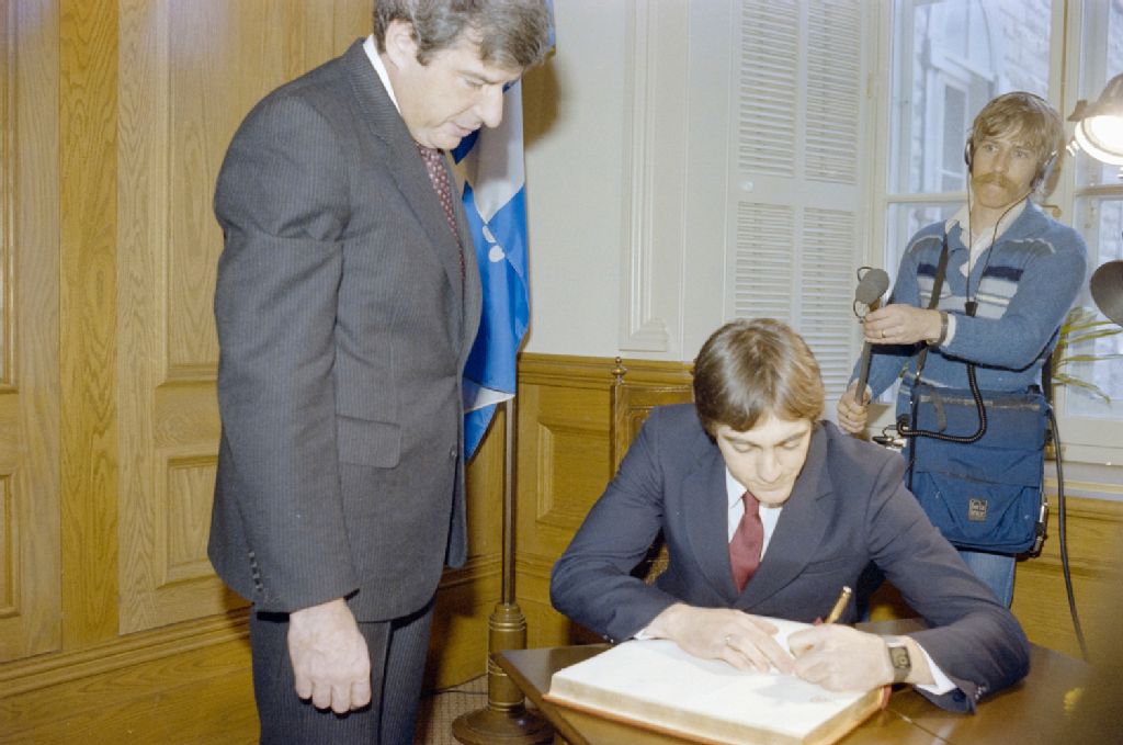 - Le gouvernement du Québec honore le champion mondial de patinage de vitesse aux jeux olympiques d'hiver de 1984 à Sarajevo : Richard Guay reçoit Gaétan Boucher à l'Assemblée nationale