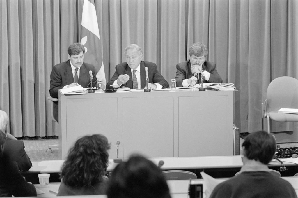Conférence de presse de Françoise Bertrand, présidente-directrice générale de Radio-Québec, 15 mars 1990, Archives nationales à Québec, Fonds Ministère des Communications, (03Q,E10,S44,SS1,D90-135), Marc Lajoie.