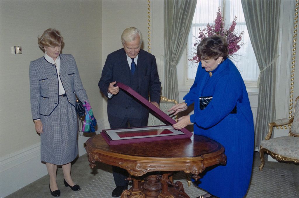 Visite au Québec du président de la République fédérale d'Allemagne, Monsieur Richard von Weizsacker et la baronne Marianne von Weizsacker : photographies officielles avec Lise Bacon, 18 septembre 1990, Archives nationales à Québec, Fonds Ministère des Communications, (03Q,E10,S44,SS1,D90-515), Bernard Vallée.