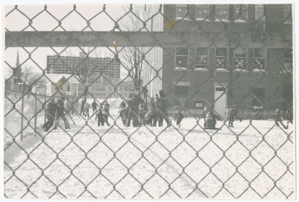 Cour de l'école Lauzon, [Entre 1969 et 1974?], Archives nationales à Gatineau, Fonds Roger Poirier, (07H,P134,S6,SS1,D3,P14), Photographe non identifié.