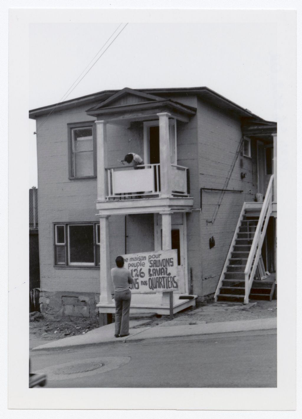 Photographie d'une maison à étage ayant une affiche devant sa façade. Deux personnes observent la pancarte, l'une depuis le balcon du deuxième étage et l'autre depuis le trottoir. Les inscriptions sur la pancarte sont les suivantes :« Une maison pour ?? peuple. Sauvons ?? 126 Laval. Sauvons nos quartiers »