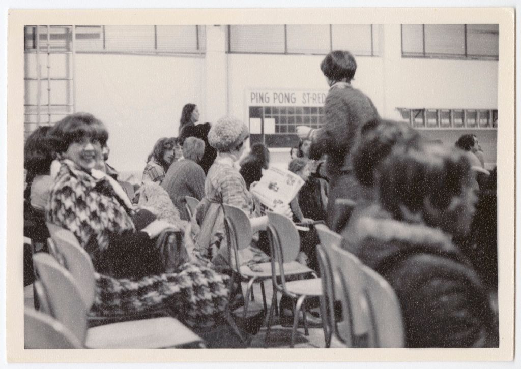 Photographie de participants à la soirée SOS Garderies du 19 février 1977. On aperçoit plusieurs femmes, dont une lisant le journal ainsi que des hommes. La soirée semble se dérouler dans une école, possiblement l'école Saint-Rédempteur à Hull.