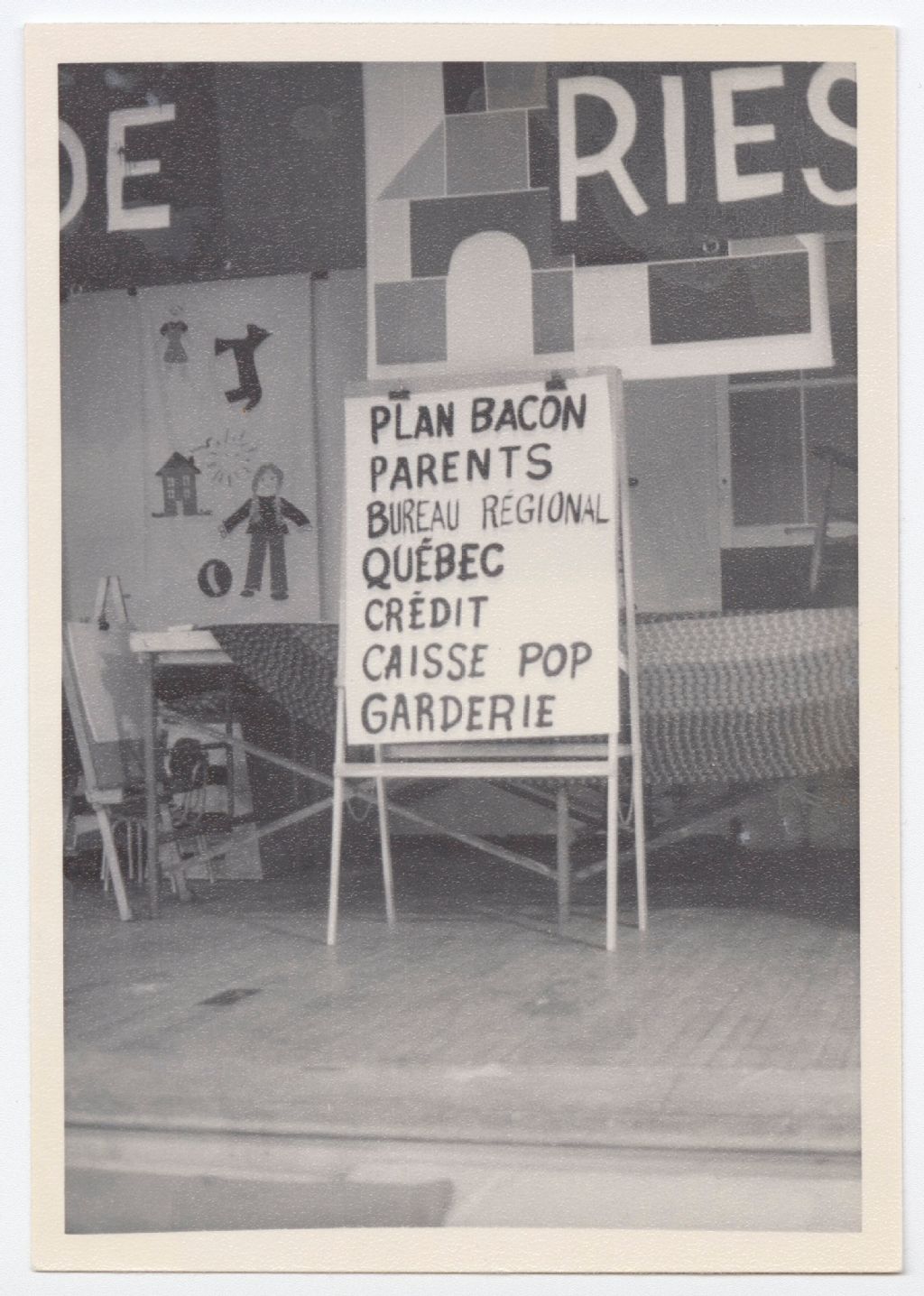 Photographie d'une affiche se trouvant sur la scène lors de la soirée SOS Garderies du 19 février 1977. On peut y lire :« Plan Bacon, Parents, Bureau régional, Québec, Crédit, Caisse Pop, Garderie »
