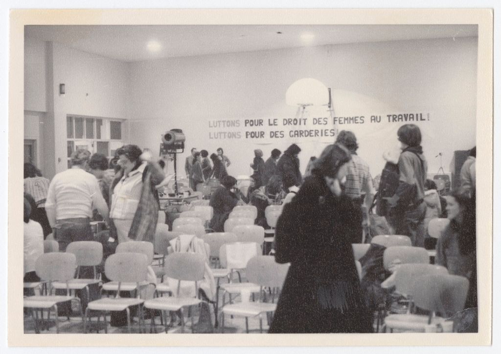 Photographie des participants qui arrivent ou quittent la soirée SOS Garderies. On voit une affiche sur le mur du fond. On peut y lire : « Luttons pour le droit des femmes au travail! Luttons pour des garderies ». La rencontre a eu lieu dans un gymnase d'une école.
