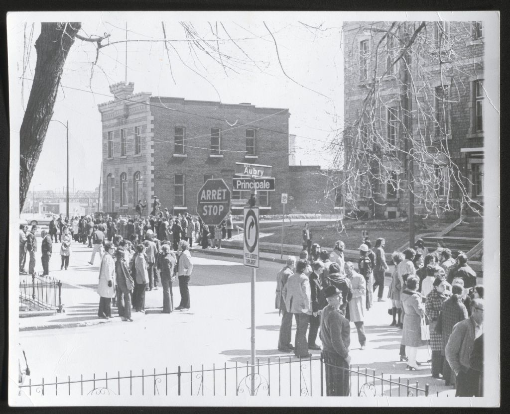 Rassemblement à l'intersection des rues Aubry et Principale, [1970-1977], Archives nationales à Gatineau, Fonds Roger Poirier, (07H,P134,S6,SS2,D1,P43), Photographe non identifié.