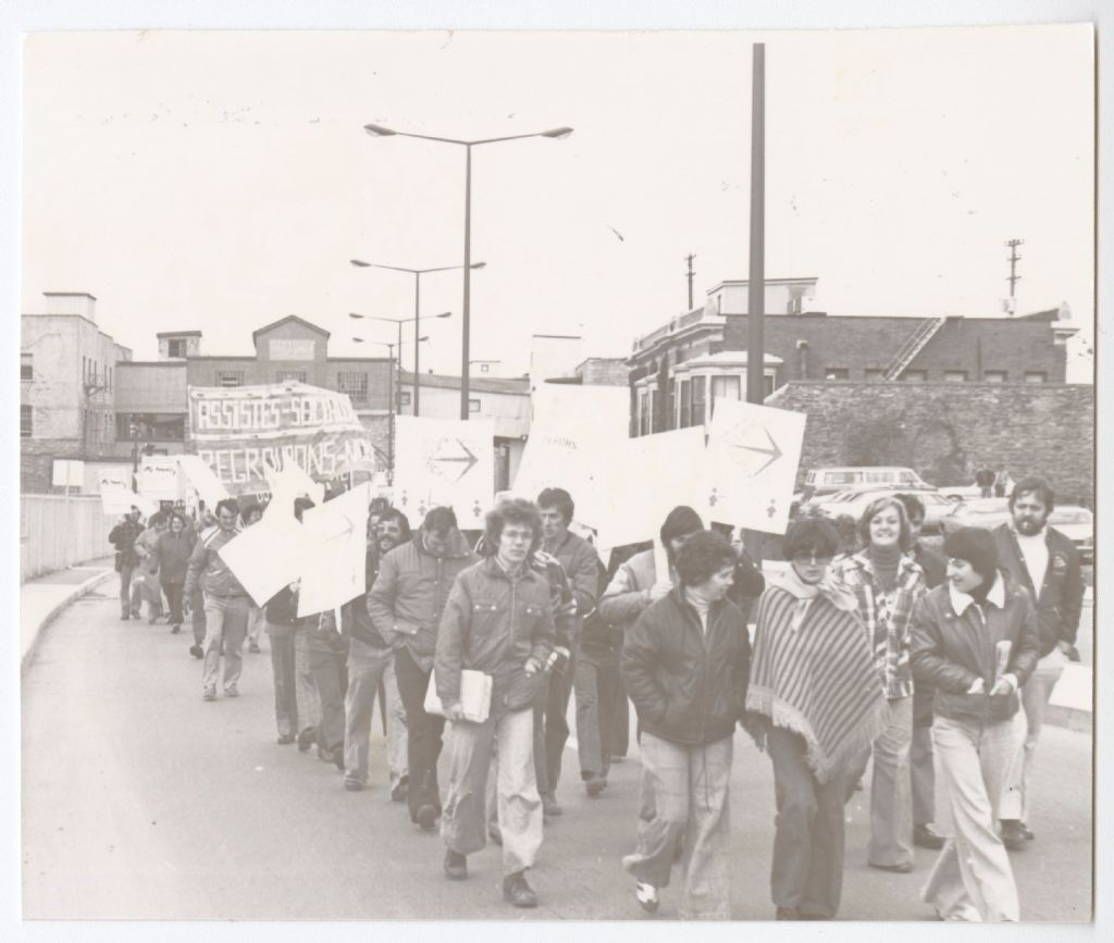 Des manifestants marchent dans la rue avec des pancartes. Sur une banderole, il est écrit: «Assistés-sociaux, regroupons-nous ». La femme aux cheveux pâles à droite de la photo est Paulette Beaudry alors enseignante au primaire.