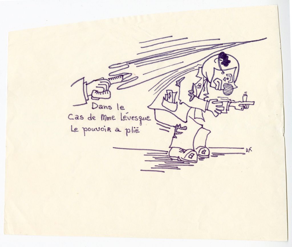Caricature d'un homme qui porte un masque de clown avec les poches de son veston remplies de billets de banque, et qui ploie sous le coup d'un long parapluie reçu sur le dos et le derrière de la tête. Un chroniqueur invisible dit : « Dans le cas de Mme Lévesque le pouvoir a plié ».