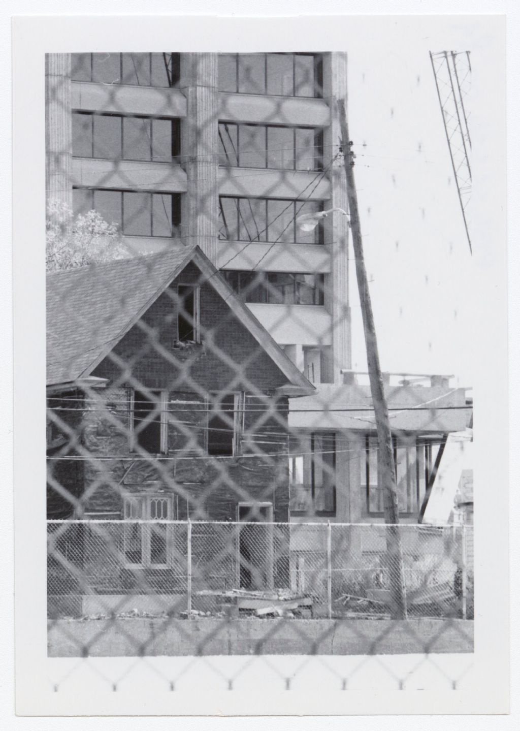 La photographie montre une maison « en bois Papillon aussi appelée Allumette », en cours de démolition rue Dollard près de l'intersection Hôtel-de-Ville. En arrière plan, on aperçoit le complexe de Place du Portage phase .