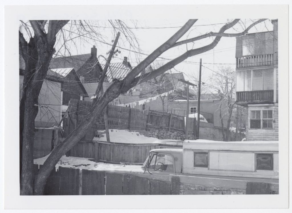 La photographie montre des arrière-cours de maisons et de logements d'habitation du vieux Hull. On voit une automobile et une corde à linge sur laquelle des vêtements sont à sécher. Les cours sont séparées par des clôtures faites de planches noircies par le temps. La photographie a été prise en hiver car il y a de la neige.