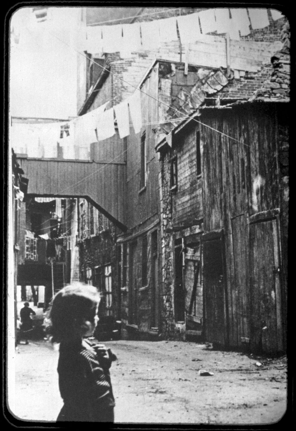 La photographie montre des arrière-cours de logements d'habitation dans un lieu et une ville indéterminées. On voit une corde à linge sur laquelle des vêtements se font sécher. Au premier plan, on voit un enfant de profil et à l'arrière-plan, on voit une deuxième personne. La photographie est sans doute une copie d'une photo ancienne.