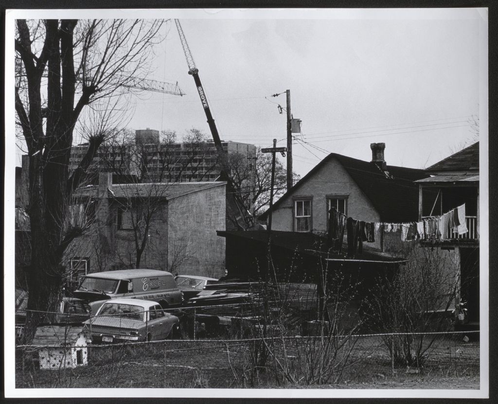 La photographie montre des arrière-cours de logements d'habitation possiblement situés rue Mance.. On voit quatre automobiles dont l'une d'elles indique "marché Excel market" sur son côté. Il y a une corde à linge sur laquelle des vêtements sont en train de sécher. Au fond, on voit l'immeuble à appartements Val-Boisé, situé au 101, rue Sacré-C¿ur ainsi que deux grues dont l'une d'elles porte la marque « GROVE ».