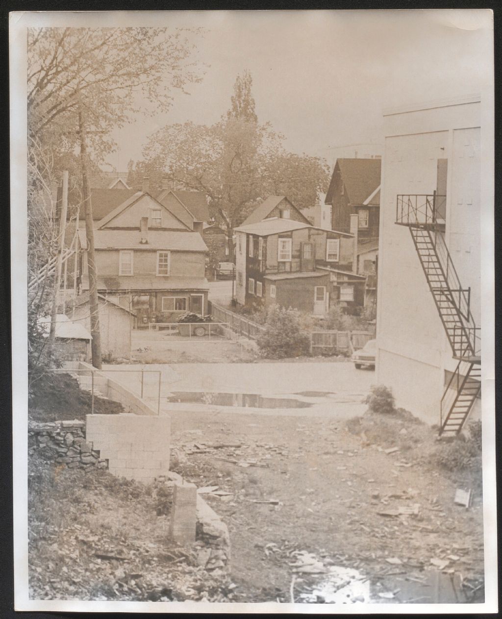 Arrière-cours de logements d'habitation rue Sainte-Hélène à Hull, [1970-1979], Archives nationales à Gatineau, Fonds Roger Poirier, (07H,P134,S6,SS3,D3,P14), S. B..
