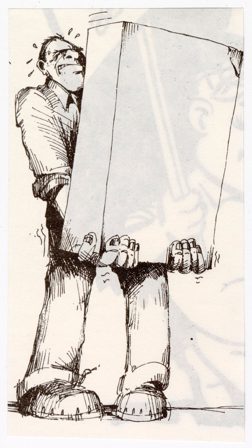 Caricature d'un homme qui tient un bloc de pierre, [1970-1980], Archives nationales à Gatineau, Fonds Roger Poirier, (07H,P134,S6,SS8,D1,P23), Photographe non identifié.