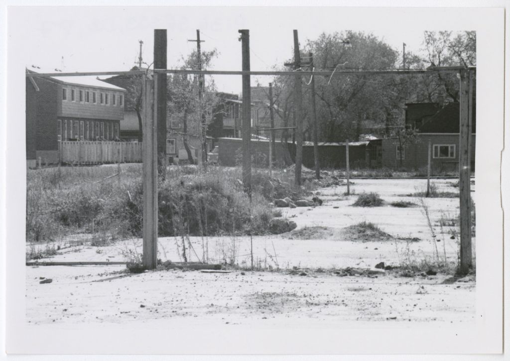 Logements à prix modique en rangée avec une maison à proximitée, [1970-1980], Archives nationales à Gatineau, Fonds Roger Poirier, (07H,P134,S6,SS9,D2,P7), Photographe non identifié.