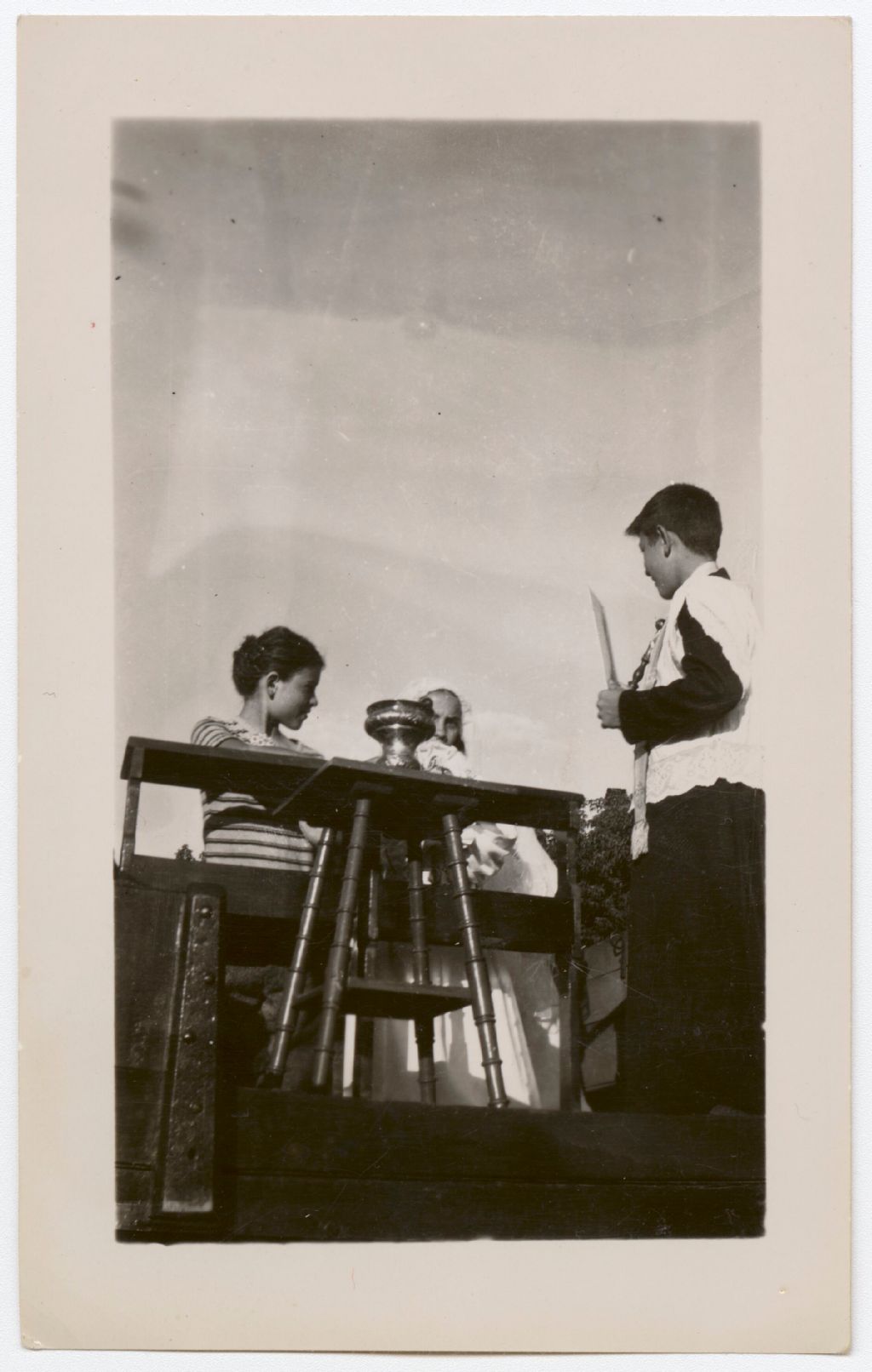 Parade de propagande, sans doute au parc Fontaine. À gauche, Ronald Desloges, au centre une personne anonyme et à droite, un enfant de ch¿ur, vu de côté, qui tient un cierge dans la main gauche.