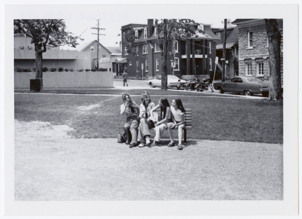Quatre jeunes filles assises sur un banc public du parc de l'hôtel de ville à Hull. À gauche, on aperçoit la phase I du complexe de Place du Portage. Au centre, en arrière-plan, la maison Gendron, rue Champlain, et à droite, la maison Carrière, rue Victoria.
