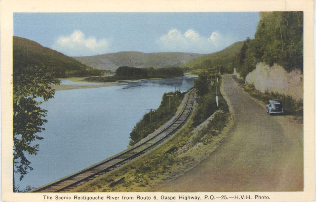 The Scenic Restigouche [sic] River from Route 6, Gaspe Highway, P. Q. La Scène de la rivière Ristigouche vue de la route 6, Grande route Gaspé, P. Q.]